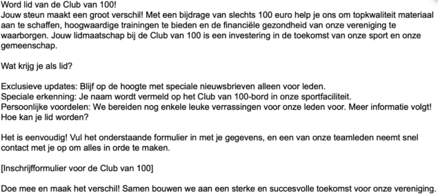 Jouw steun maakt een groot verschil! Met een bijdrage van slechts 100 euro help je ons om topkwaliteit materiaal aan te schaffen, hoogwaardige trainingen te bieden en de financiële gezondheid van onze vereniging te waarborgen. Jouw lidmaatschap bij de Club van 100 is een investering in de toekomst van onze sport en onze vereniging.